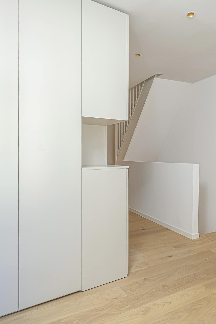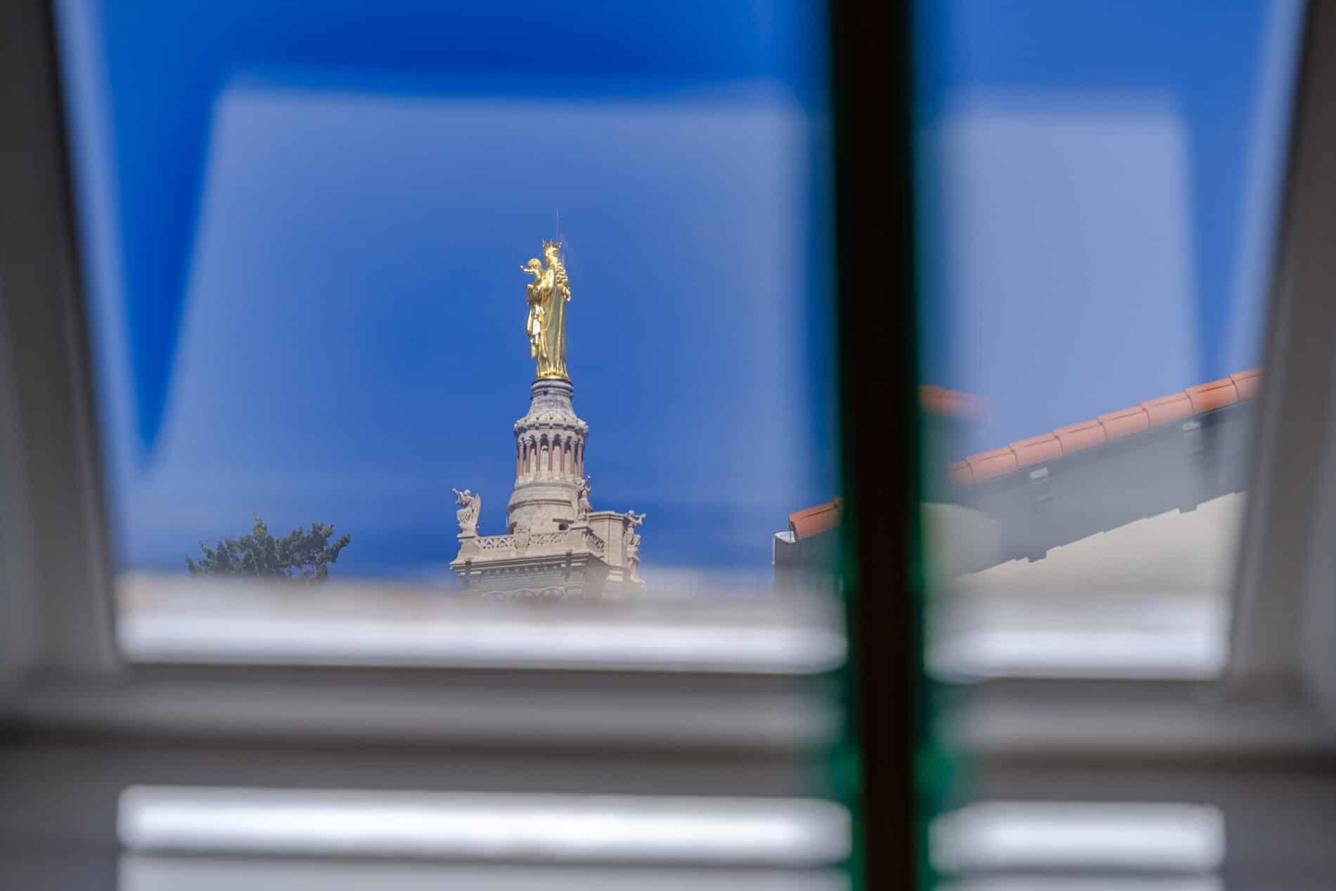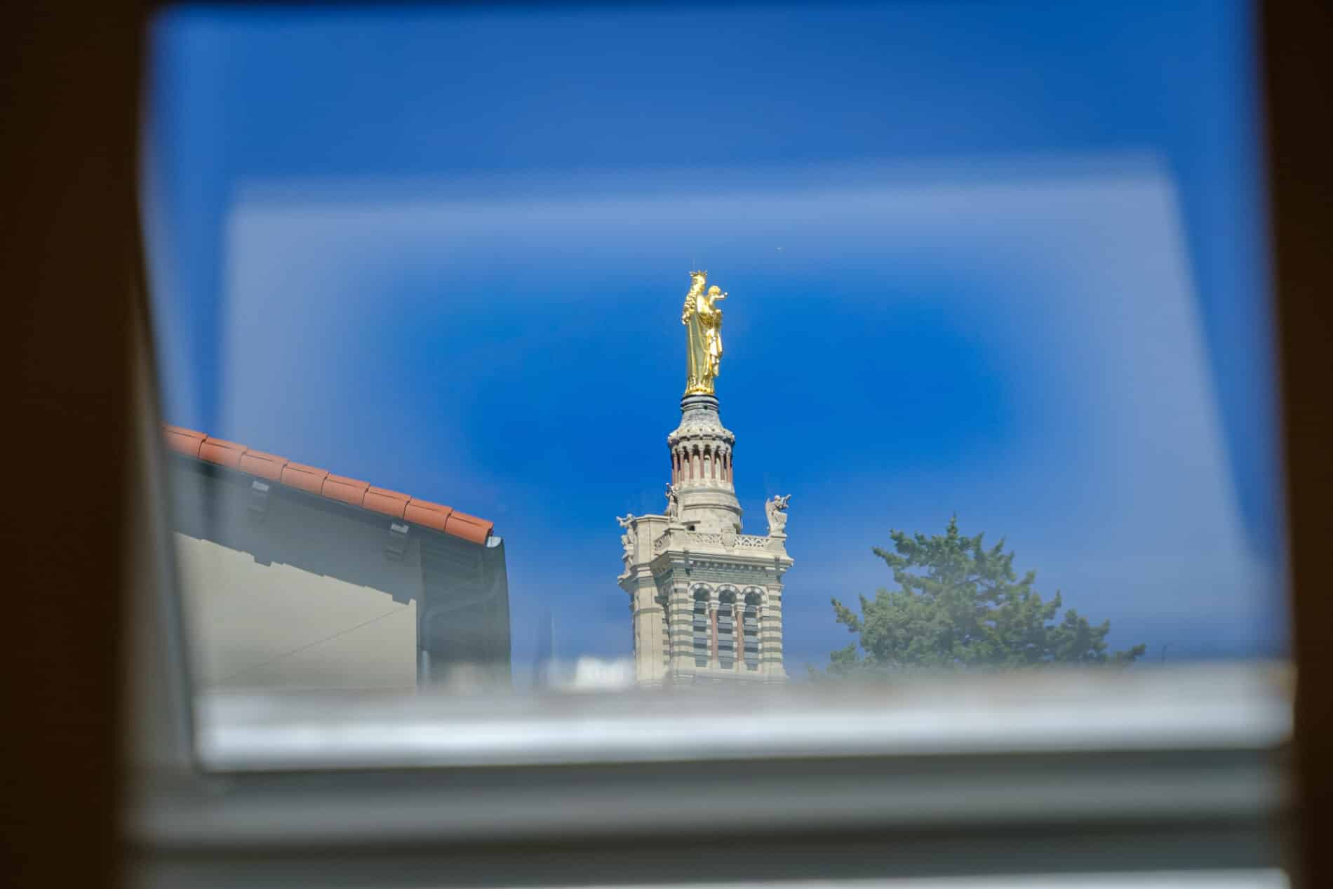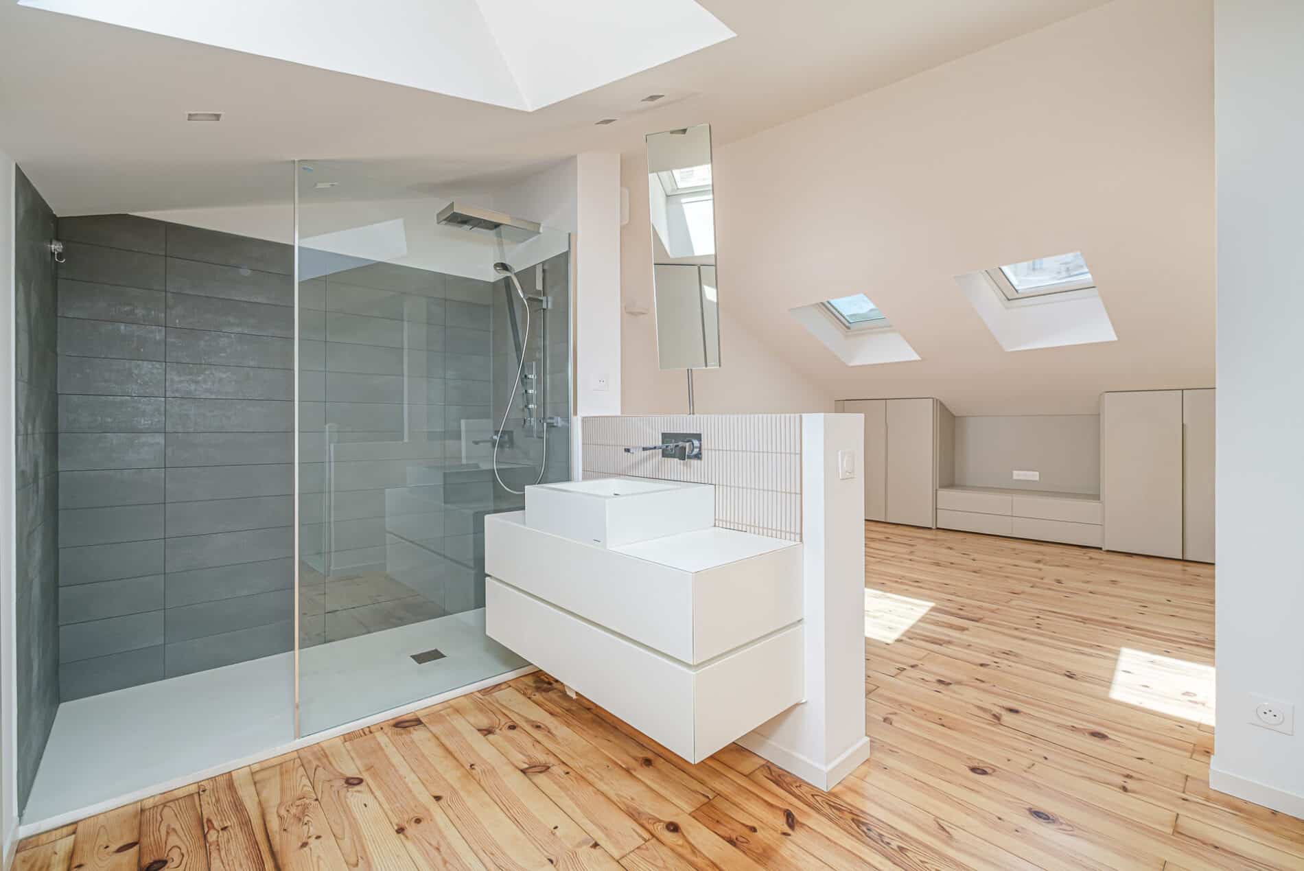 Sous les toits coiffés de velux, le dernier niveau est réservé à l’espace parental où chambre, dressings gris perle et salle d’eau cohabitent sous la protection de la Bonne Mère.