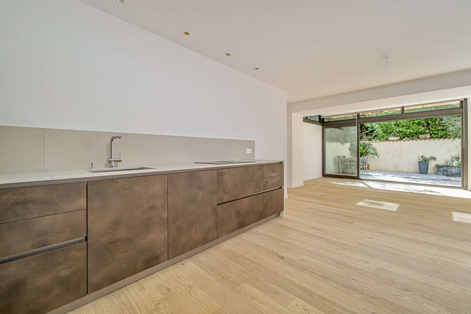 Un escalier vêtu de chêne blond descend à la pièce de vie, décloisonnée et lumineuse, ouverte sur une terrasse de 25m2 bordée d’arbres provençaux. Ici, une cuisine laboratoire de facture italienne borde le coin repas. Derrière une porte dérobée, un cellier cache la buanderie et une cave à vins. Le salon s’ouvre sur le jardinet Sud-Ouest dont seuls le chant des pinsons et le friselis du vent dans les feuilles viennent troubler la tranquillité.