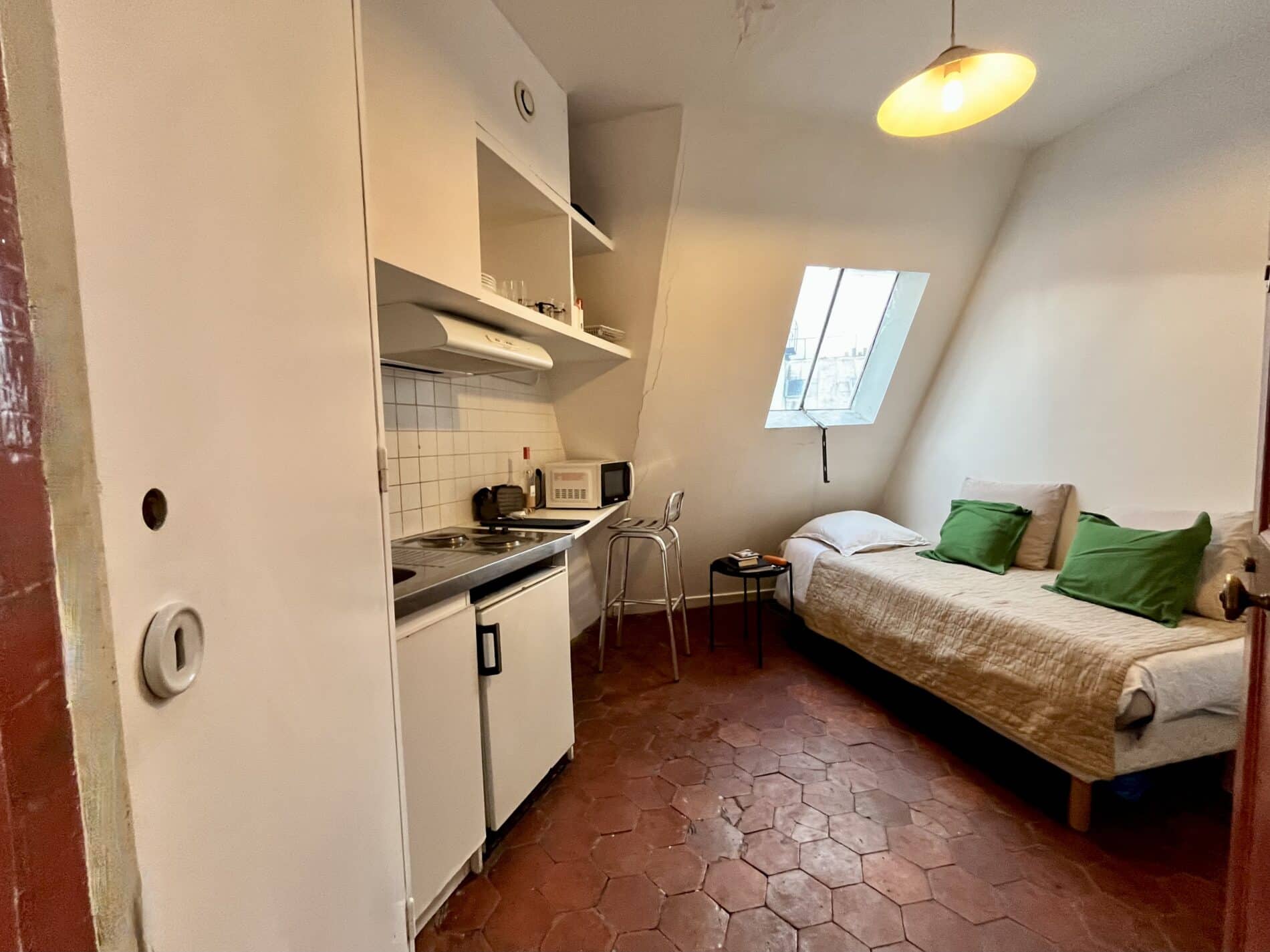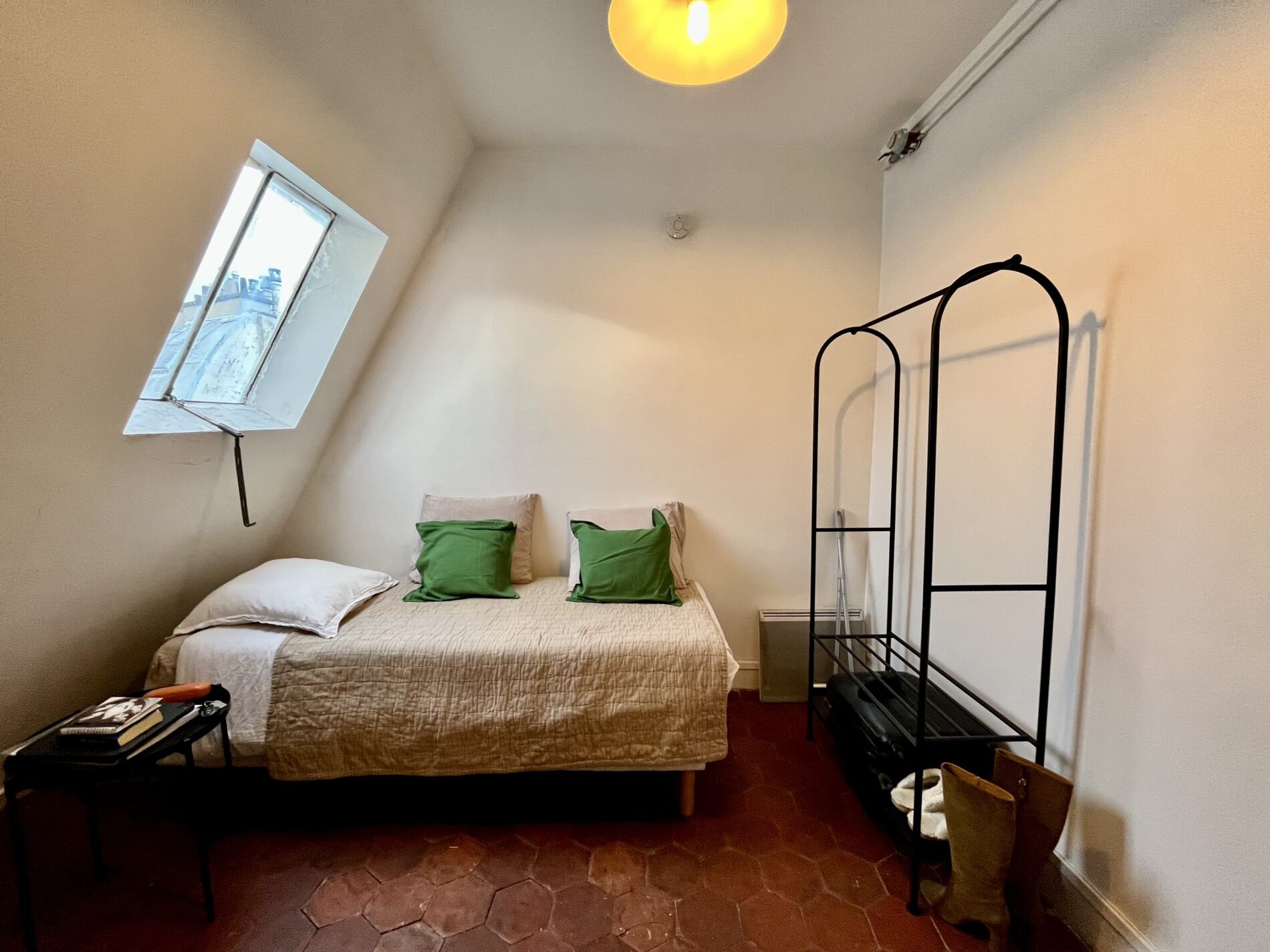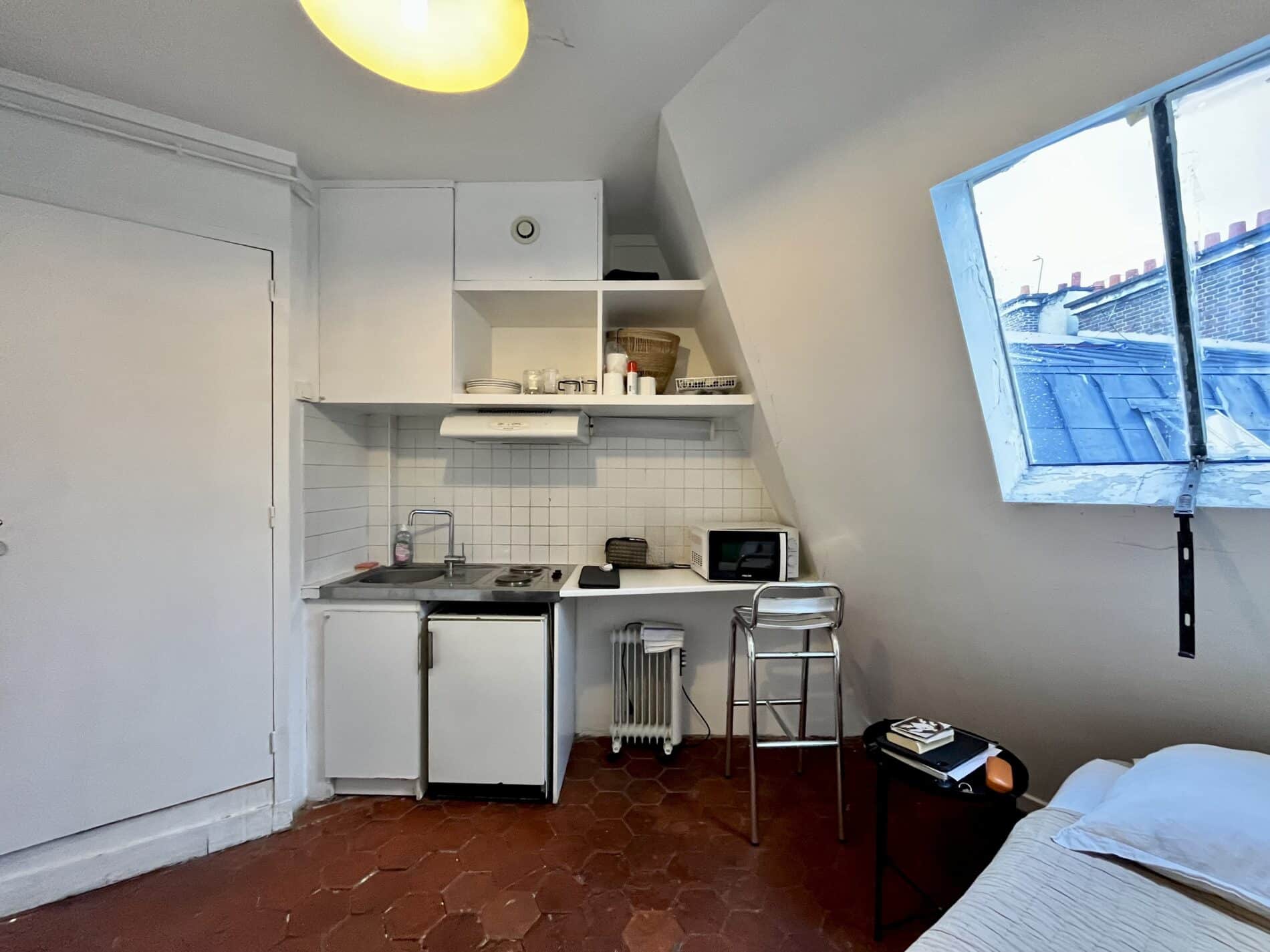 Située au 6e étage par escalier de service d’un immeuble haussmannien du boulevard Saint-Germain, cette chambre de service au calme absolu nécessite des travaux de rénovation.