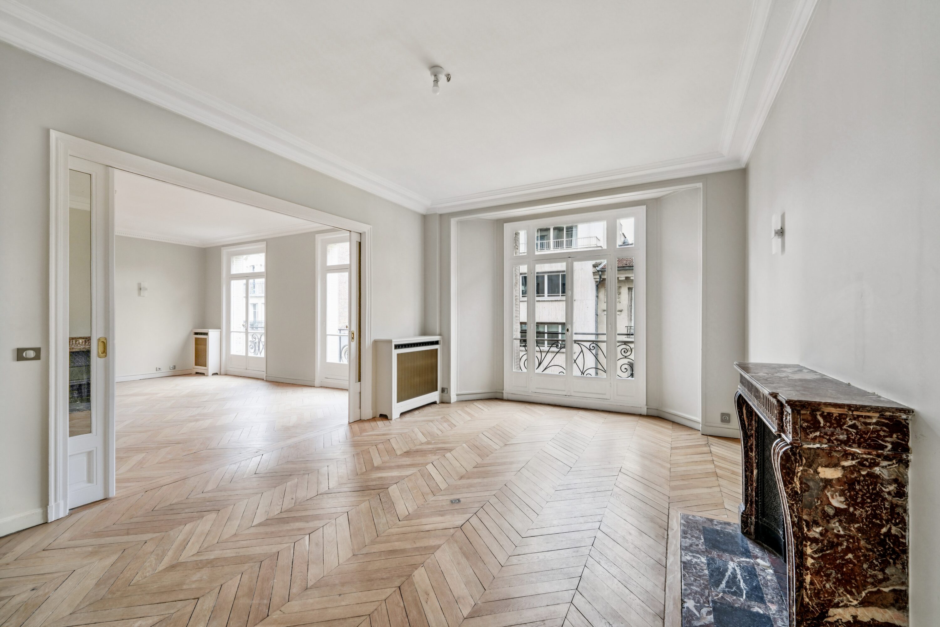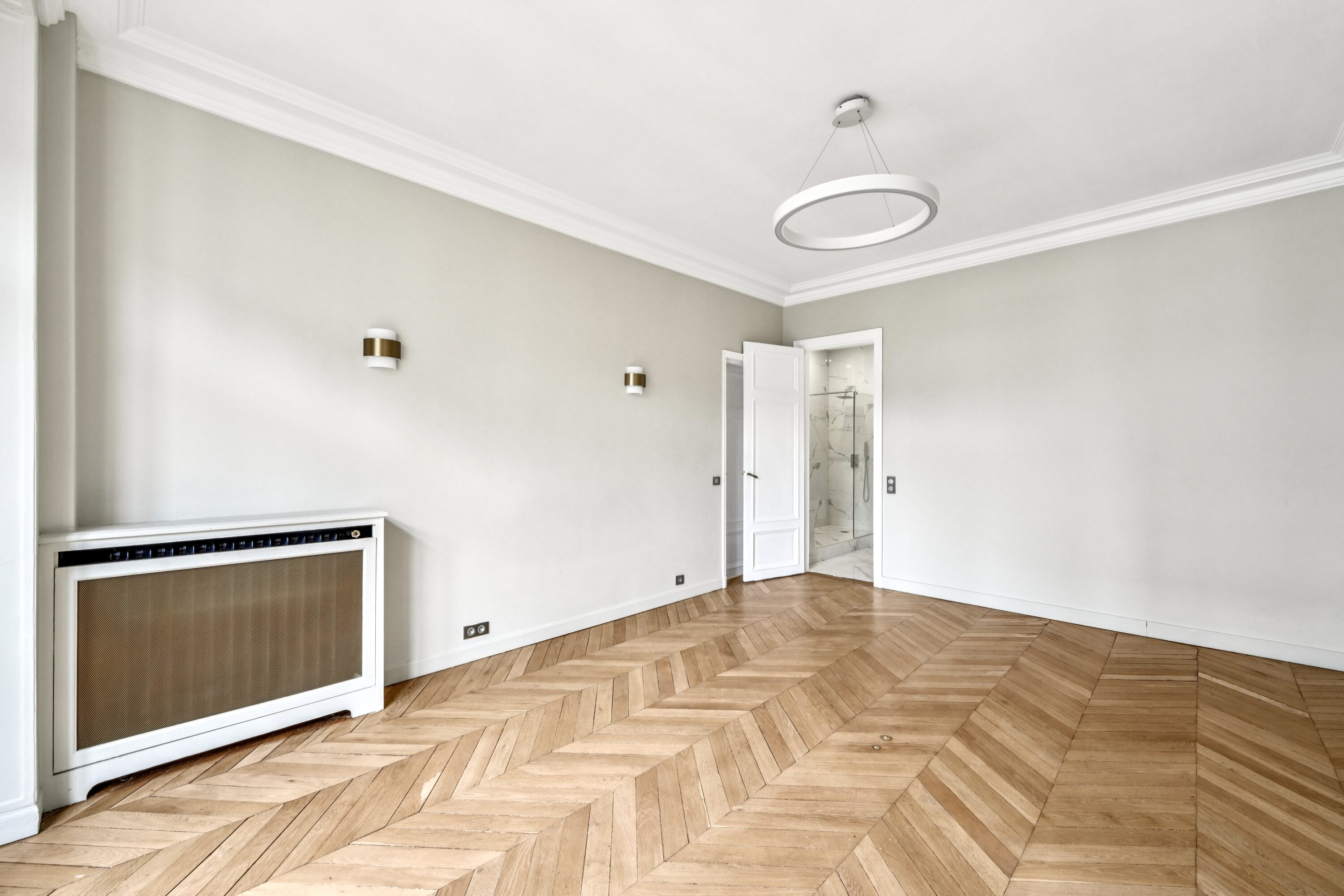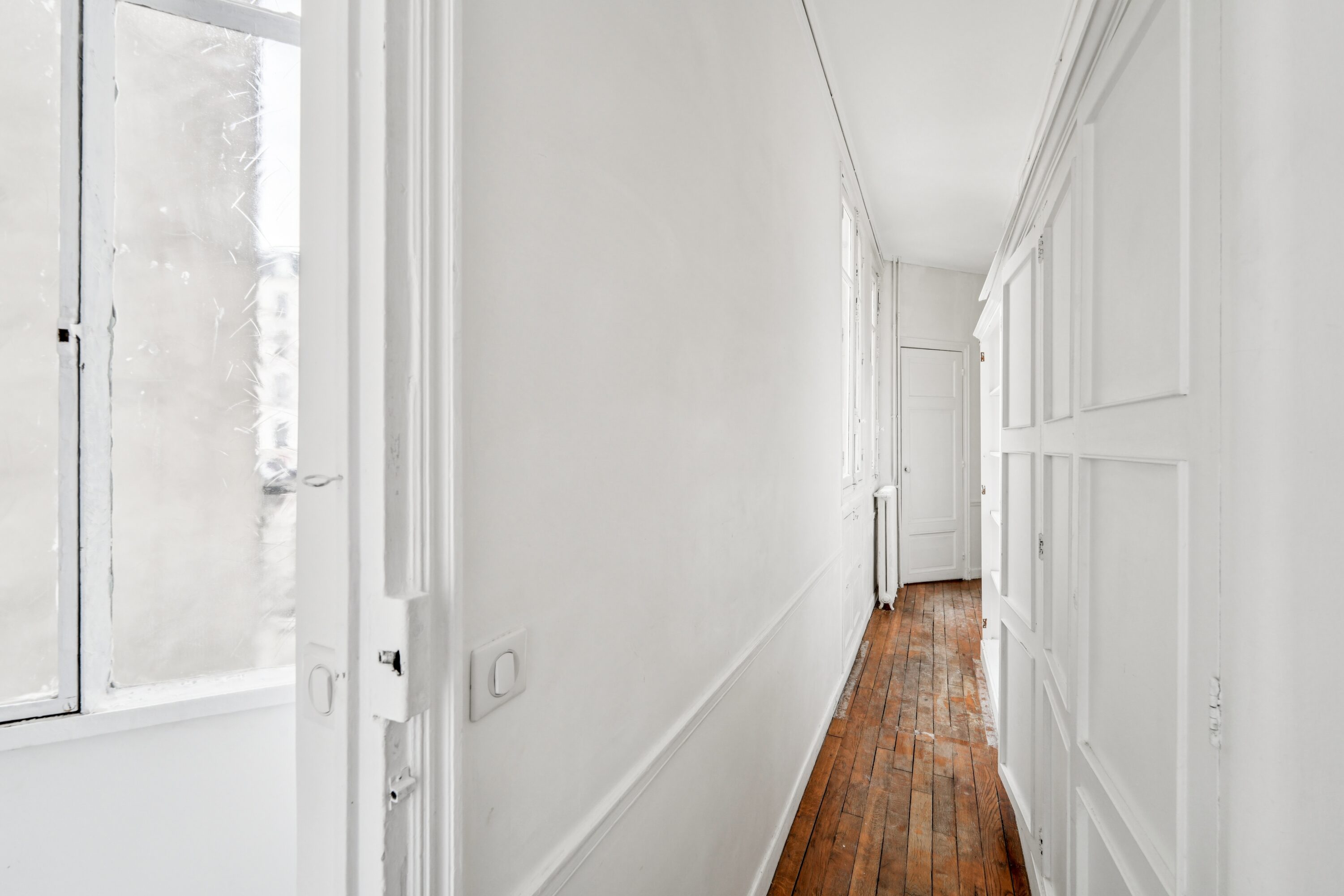 L’entrée s’ouvre sur un hall parqueté de chêne blond, poumon central de l’appartement distribuant la quasi totalité des espaces, dont l’on entrevoit la superbe hauteur sous-plafonds.
