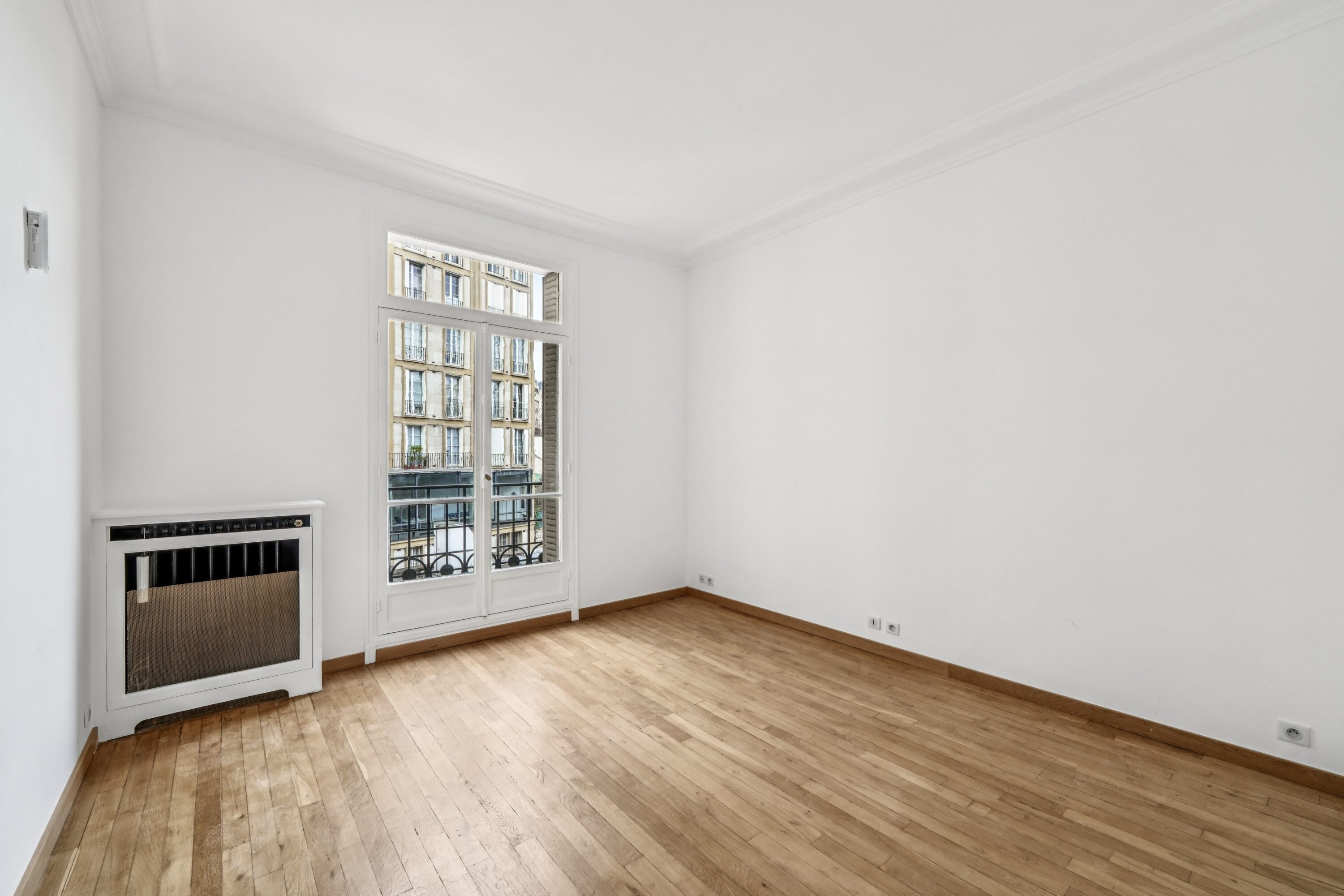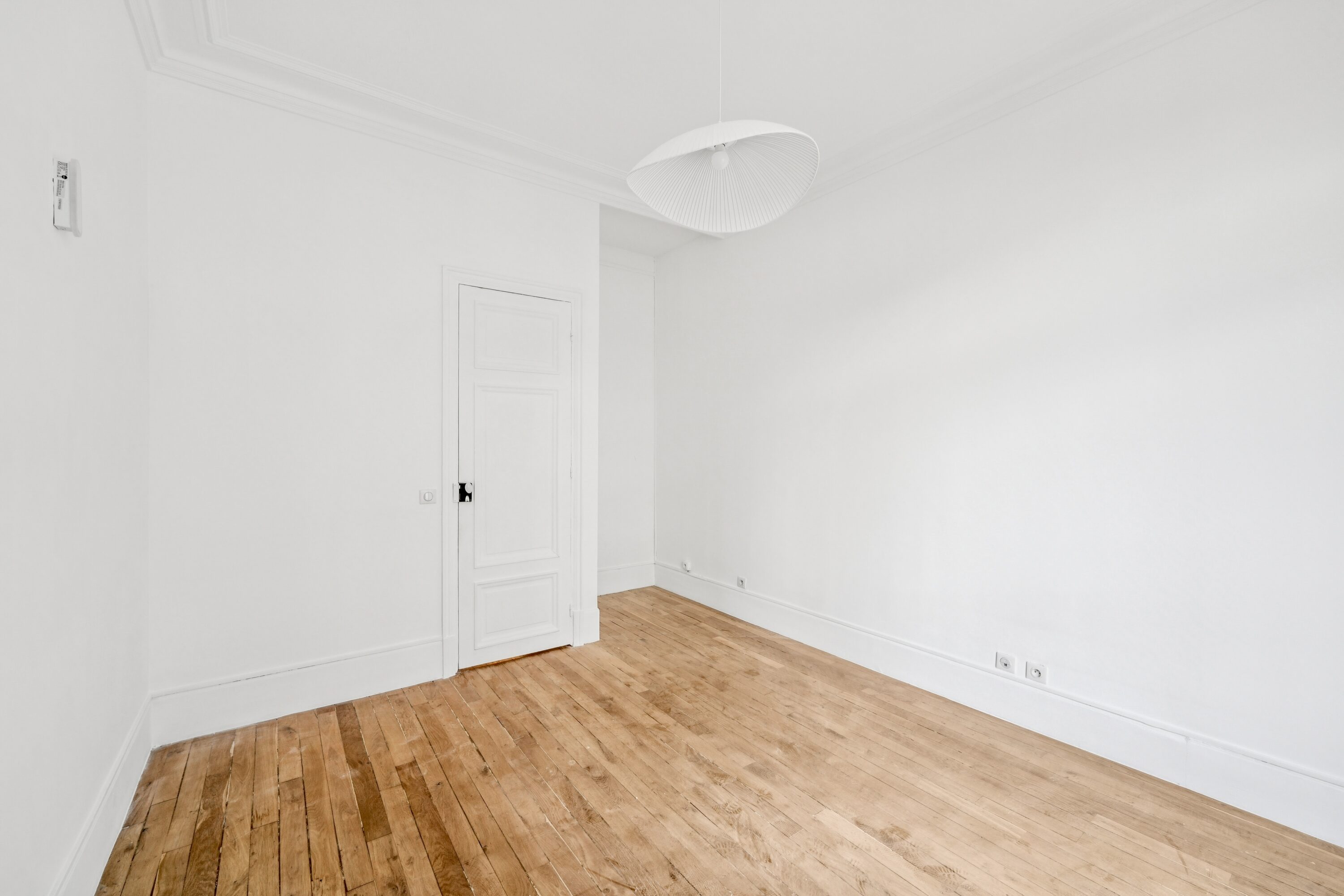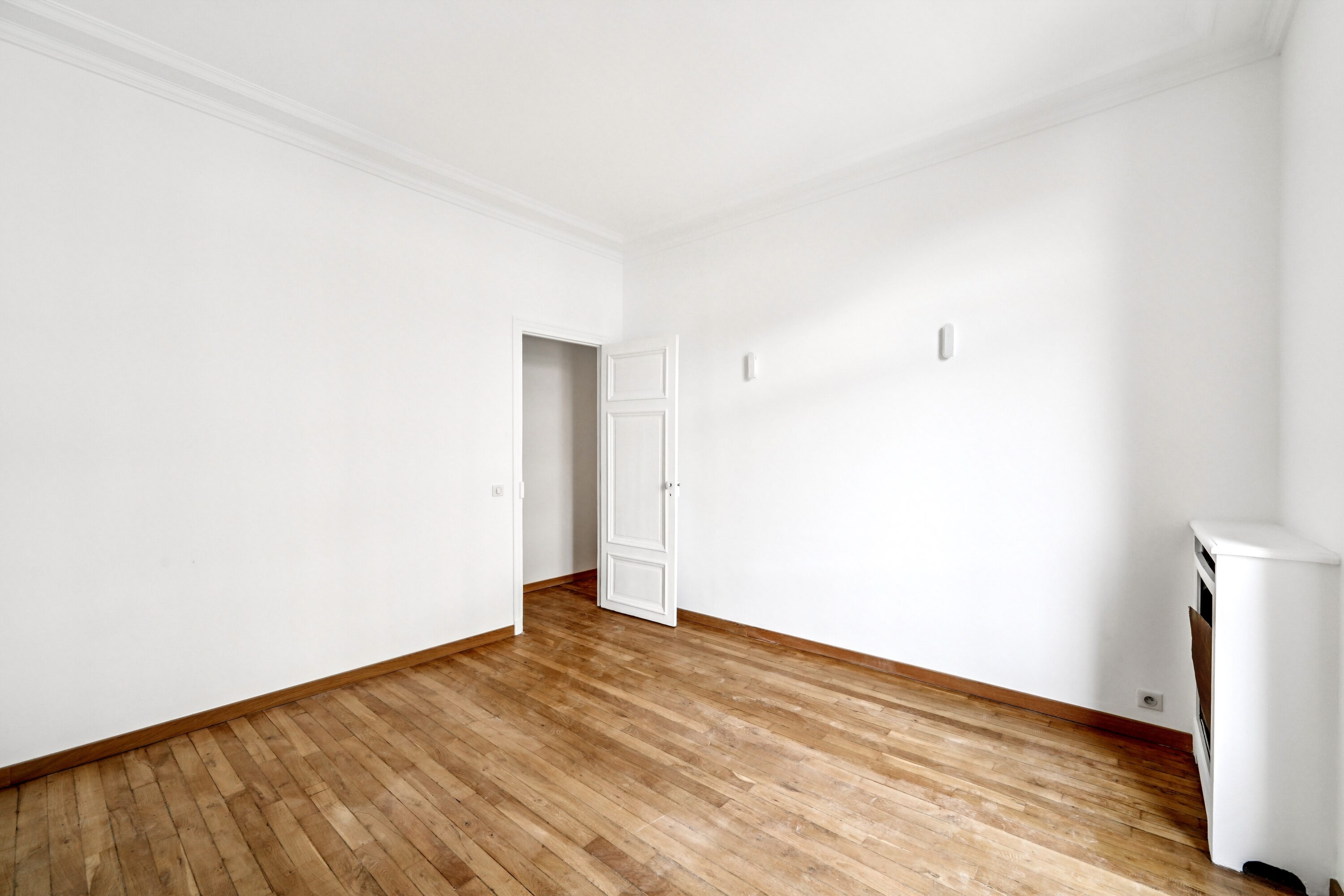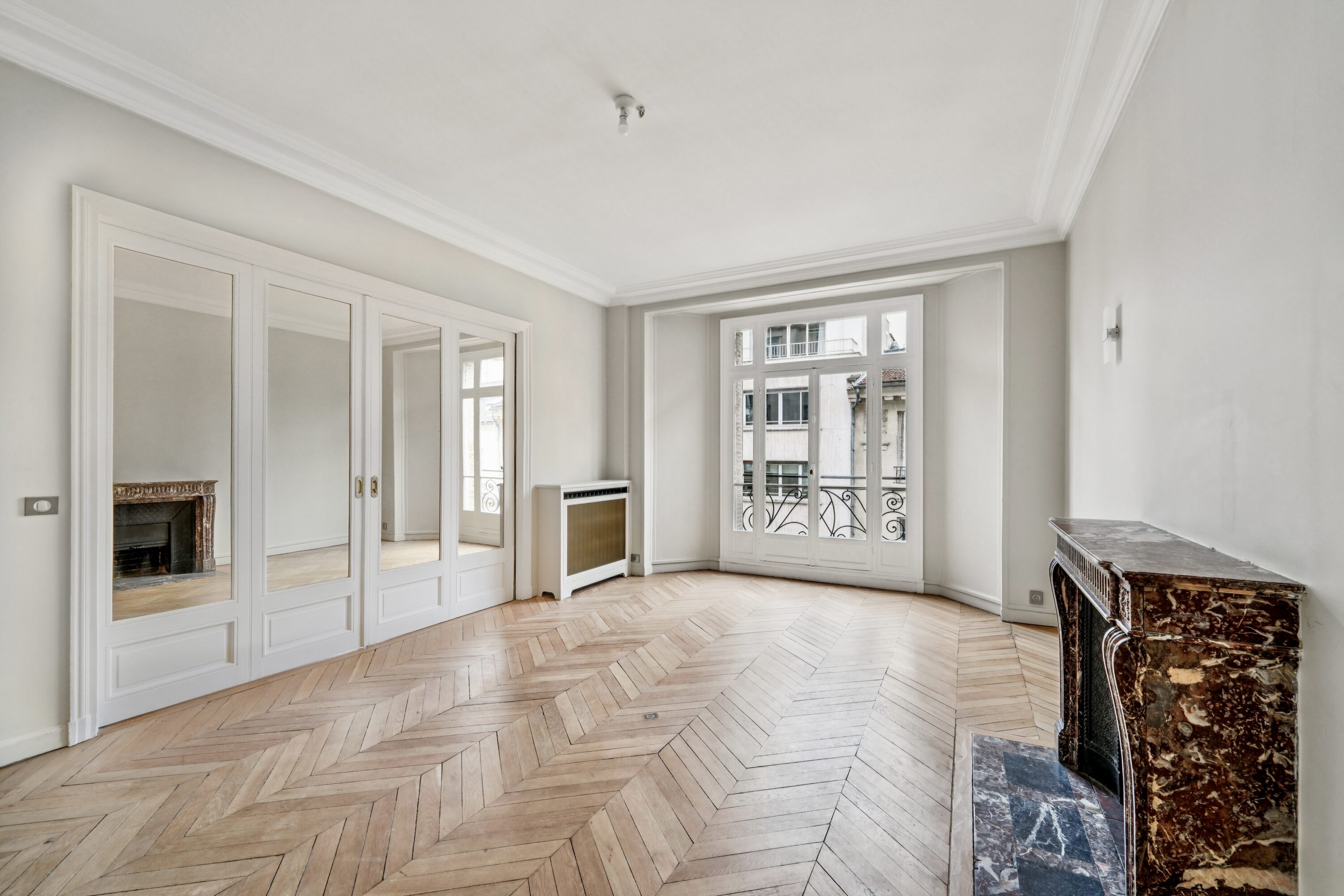 L’entrée s’ouvre sur un hall parqueté de chêne blond, poumon central de l’appartement distribuant la quasi totalité des espaces, dont l’on entrevoit la superbe hauteur sous-plafonds.