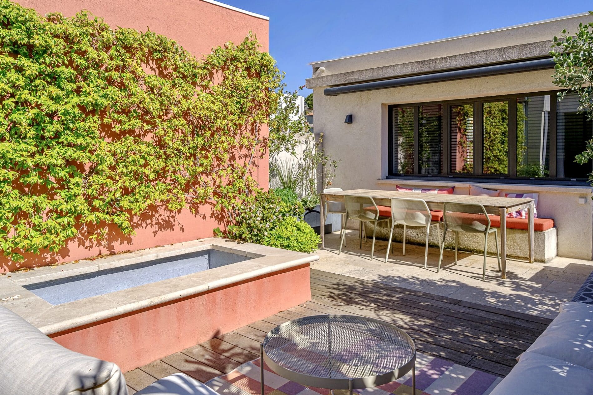 Posée sur ce volume, la terrasse a été traitée en patio, vêtu de bois exotique et bordé d’essences méditerranéennes, autour duquel se font face la maison principale et sa maison d’amis. Ici, un petit bassin rafraichissant prolonge la façade Terracotta que recouvre un jasmin grimpant et un banc maçonné sert d’assise aux déjeuners ensoleillés.