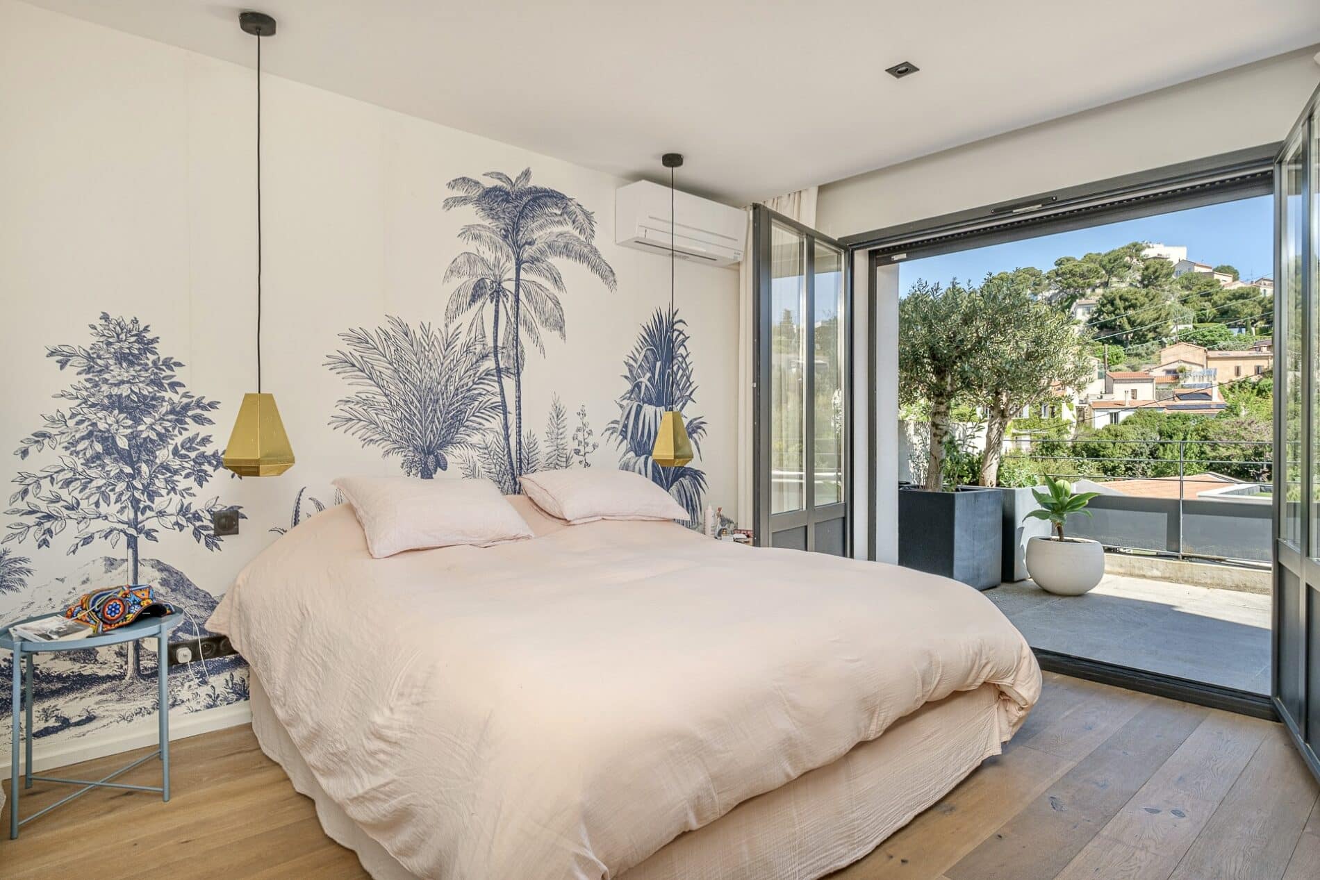 Au dessus, deux chambres jumelles aux murs saupoudrés de bleu canard, profitent du panorama avec davantage de hauteur.