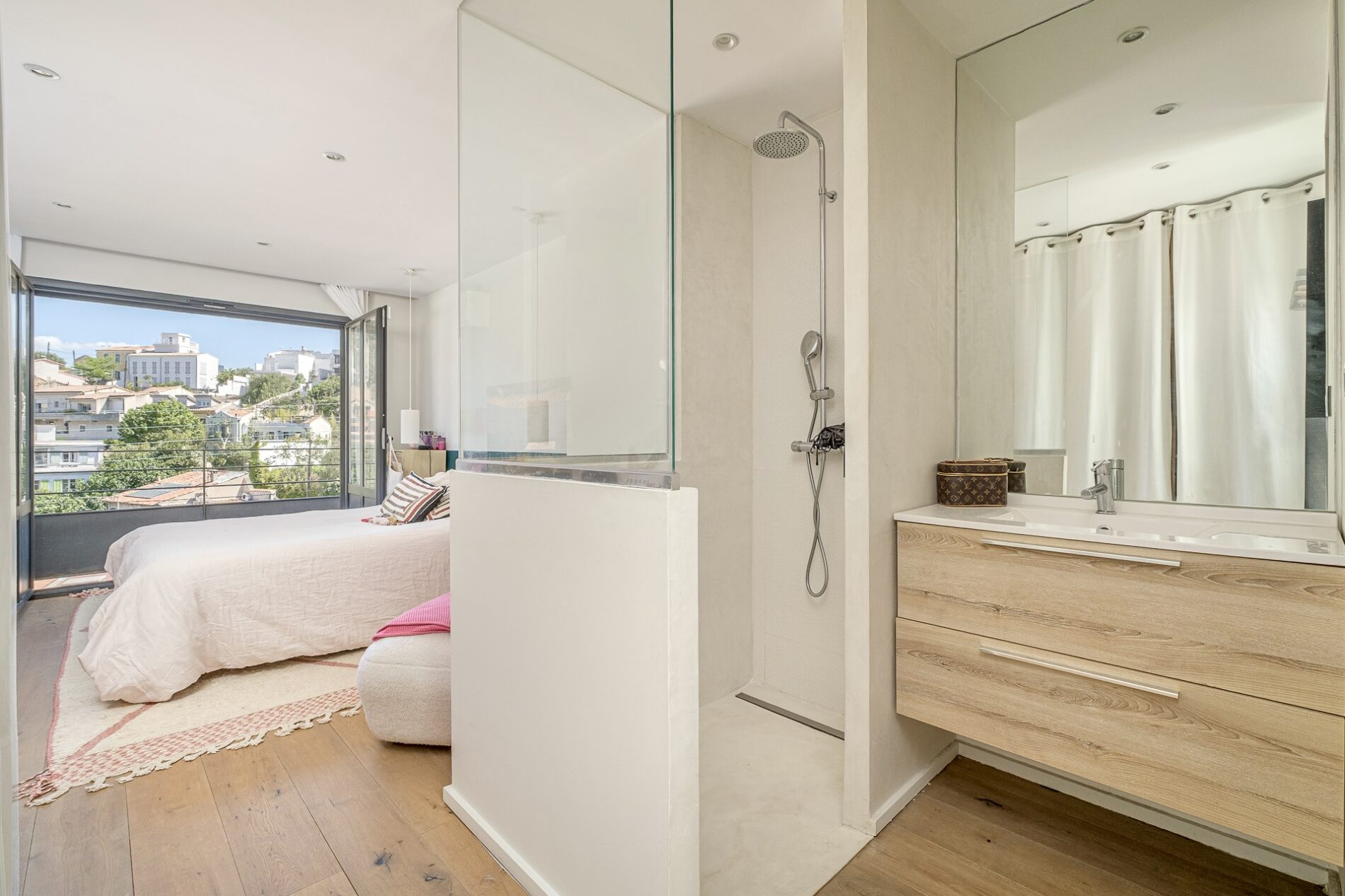 L’entrée se fait par le volume réception, dont les baies vitrées s’ouvrent entièrement pour un effet dedans-dehors. Une cheminée à insert réchauffe les soirées d’hiver et apporte un supplément d’âme à ce volume décloisonné aux tonalités pastels, rehaussées par le mur Terracotta qui s’invite le long du coin repas et se prolonge jusque dans la cuisine, à demi cachée par une verrière atelier. A l’arrière, une buanderie côtoie une sortie sur un escalier creusé dans la rocaille, menant à une charmante terrasse à l’entresol.