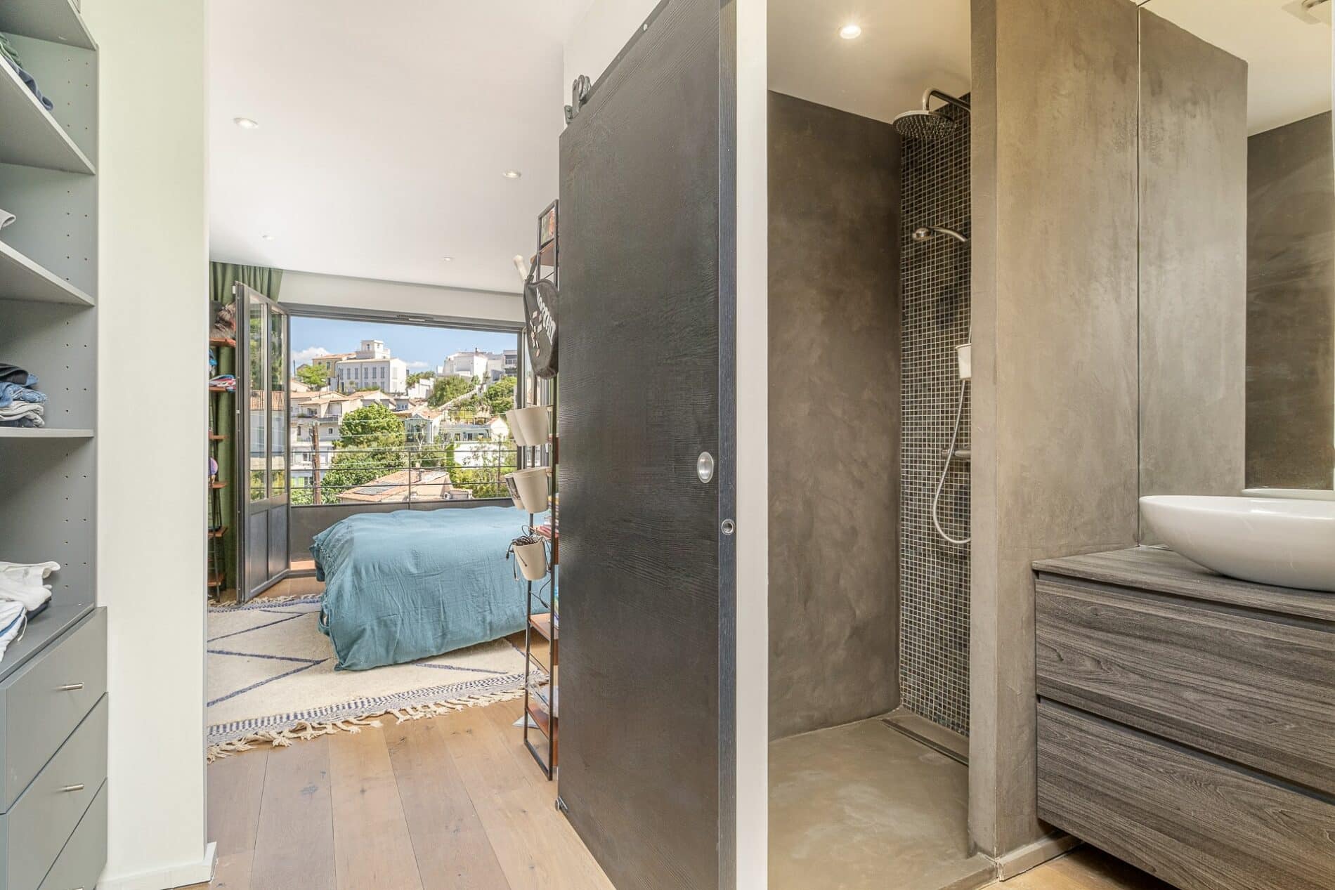 Le premier niveau, entièrement réservé aux parents, abrite un bureau, deux dressings en vis-à-vis à l’entrée de la chambre, dont le papier peint panoramique fait écho au paysage sur lequel sort la terrasse, offerte à la vue sur le vallon et la Bonne Mère.