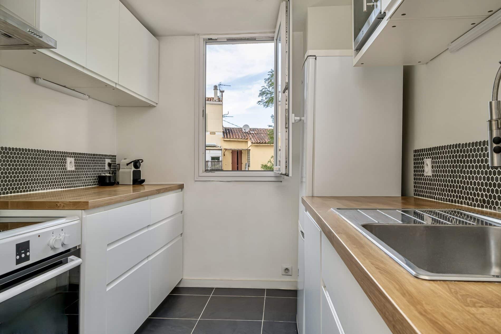 L’entrée avec rangement s’ouvre directement sur la pièce de vie exposée à l’Ouest et dessert la cuisine, semi-ouverte et fonctionnelle, offrant une vue pittoresque sur les maisons du quartier.